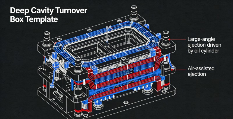 التحدي: يؤدي الحجم الكبير والجدران السميكة للحاويات اللوجستية إلى فترات تبريد طويلة، مما يحد من القدرة الإنتاجية. الحل: تصميم قنوات تبريد تسلسلية عالية السرعة متعددة الطبقات تغطي بكثافة جميع المناطق ذات الجدران السميكة. بالنسبة للحاويات ذات التجويف العميق، قم بدمج "القاذفات المائلة ذات الزاوية الكبيرة التي تعمل بأسطوانة هيدروليكية" مع "القذف بمساعدة الغاز" لضمان التشكيل السلس والسريع في أقل وقت ممكن دون تشوه أو التصاق فراغي، مما يقلل من دورات الإنتاج.