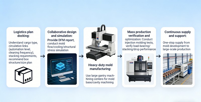 1. محاذاة الحلول اللوجستية: فهم نوع البضائع الخاصة بك، ومراحل المناولة (على سبيل المثال، مستوى الأتمتة، وتكرار التنظيف)، ومتطلبات التراص للتوصية بالهيكل الأمثل للحاوية وحلول الحجم. 2. التصميم التعاوني والمحاكاة: توفير تقارير سوق دبي المالي الشاملة وإجراء محاكاة لتدفق القالب والتبريد والضغط الهيكلي لضمان حلول القالب المثالية من حيث الأداء والتكلفة. 3. تصنيع القوالب للخدمة الشاقة: استخدم مراكز المعالجة العملاقة الكبيرة لضمان الدقة والصلابة في تصنيع قواعد وتجويف القوالب الكبيرة. 4. التحقق من صحة الإنتاج الضخم وتحسينه: إجراء اختبار إنتاج مستمر على آلات القولبة بالحقن للتحقق من صحة مقاييس الأداء المهمة (اختبارات التحمل والتكديس والسقوط) ووضع اللمسات النهائية على العمليات. 5. العرض والدعم المستمر: نحن نقدم إمدادًا شاملاً بدءًا من تطوير القالب وحتى إنتاج قوالب الحقن على نطاق واسع، مما يضمن جودة المنتج المتسقة والتسليم في الوقت المناسب.